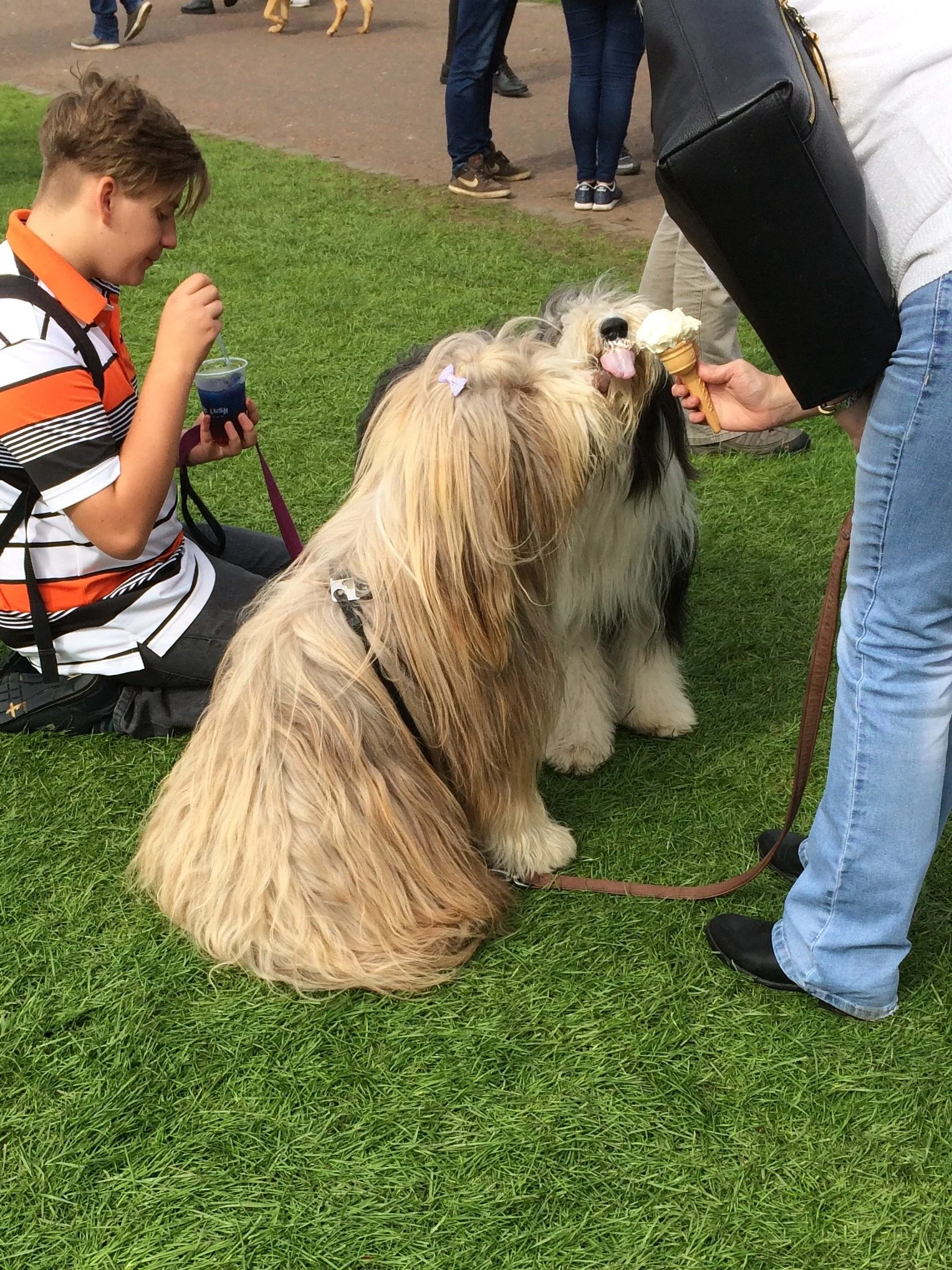 We had just enough time to take in Edinburgh’s scholarly, sand-colored architecture before it was time to drive to the Glasgow green. The pipers and drummers came from all over Scotland and the world. Tartan kilts and matching socks gleamed in the welcoming sunshine. A spectator fed an ice cream cone to two sheepdogs adorned with little bows. The din was glorious.